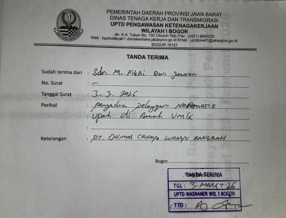 Dalam laporan pengaduan normatif ketenagakerjaan yang disampaikan, Fikri mengungkapkan bahwa selama masa kerjanya ia menerima upah yang diduga berada di bawah ketentuan Upah Minimum Kabupaten (UMK) Bogor yang berlaku.